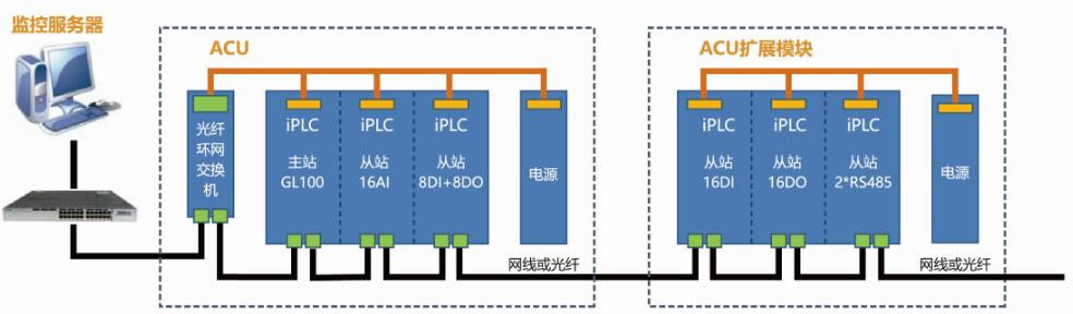 ACU(區域控制單元,Area Control Unit),負責工業(yè)現場(chǎng)特定區域的信號采集、控制輸出和遠程通信及本地告警顯示等任務(wù),一般由可編程邏輯控制器(PLC)、工業(yè)交換機、電源、保護模塊和防護機柜等部分組成。