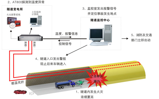 分布式光纖隧道火災監測系統采用感溫光纖作為探測器,使用多通道、高速、集中光電測溫主機進(jìn)行信息采集與處理,能實(shí)時(shí)監測整個(gè)隧道內的溫度變化及火焰蔓延方向,對隧道內的火災情況進(jìn)行全面監測。上位監控計算機位于控制中心,控制室外的現場(chǎng)只布設感溫光纜,大大提高了系統可靠性,全套系統能夠很好滿(mǎn)足隧道火災進(jìn)行在線(xiàn)溫度監測的要求,是現代消防報警的理想高科技產(chǎn)品。